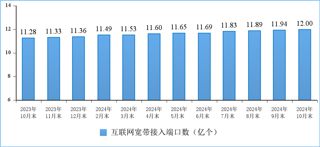 截至10月末,全國互聯(lián)網(wǎng)寬帶接入端口數(shù)量達(dá)12億個,比上年末凈增6370萬個。其中,光纖接入(FTTH/O)端口達(dá)到11.6億個,比上年末凈增6141萬個,占互聯(lián)網(wǎng)寬帶接入端口的96.4%。截至10月末,具備千兆網(wǎng)絡(luò)服務(wù)能力的10G PON端口數(shù)達(dá)2761萬個,比上年末凈增458.6萬個。截至10月末,5G基站總數(shù)達(dá)414.1萬個,比上年末凈增76.4萬個,占移動基站總數(shù)的32.8%,占比較上年末提高3.7個百分點(diǎn)。