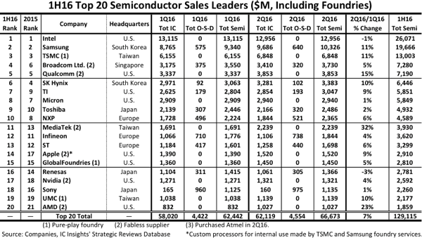 Iccsz訊 半導體市場研究公司IC Insights公布了2016年上半年全球前二十大半導體(包括集成電路、光電器件、傳感器和分立器件)公司銷售額排名。前二十大半導體公司美國獨占8家,日本、歐洲、中國臺灣各3家,韓國2家,新加坡1家。