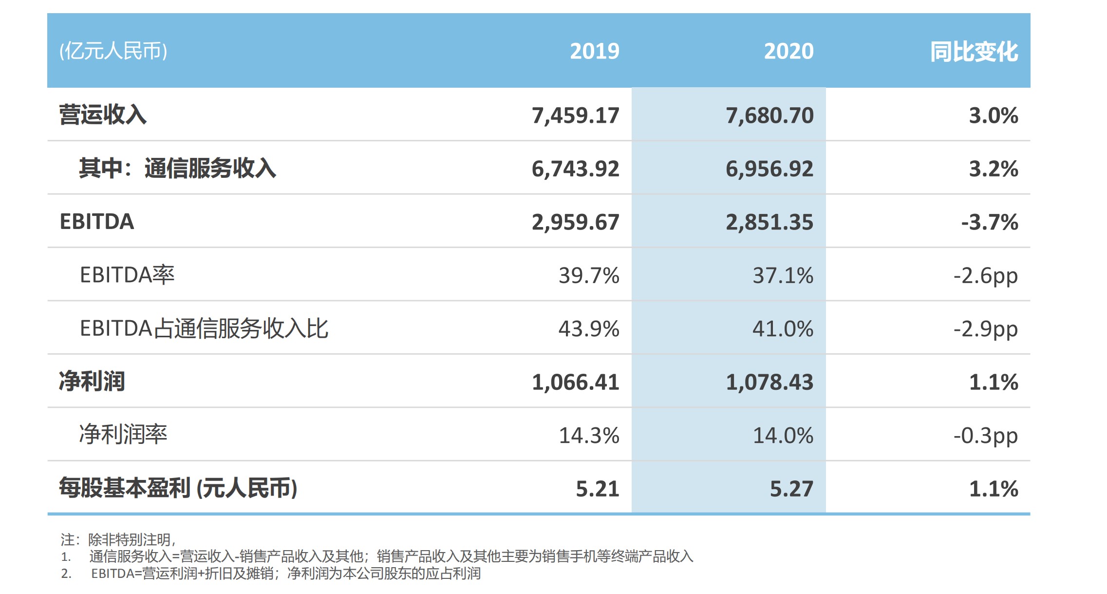 ICC訊 中國移動今日發(fā)布2020年年度業(yè)績報告,報告顯示,2020年中國移動營運收入為人民幣7681億元,同比增長3.0%。其中,通信服務(wù)收入為人民幣6957億元,同比增長3.2%,增速較前兩年顯著提升,呈現(xiàn)良好的發(fā)展勢頭。凈利潤1078億元,同比增長1.1%,扭轉(zhuǎn)了2019年凈利潤下滑的趨勢,實現(xiàn)了平穩(wěn)增長。