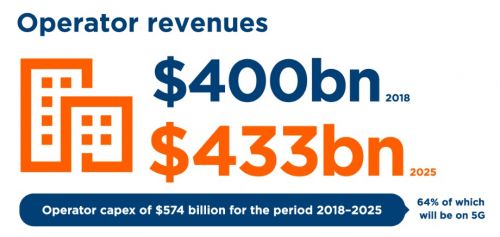 2018-2025年期間,運(yùn)營商預(yù)計(jì)將在新網(wǎng)絡(luò)方面投資5740億美元(資本支出),其中近三分之二(3700億美元)將用于新推出的5G網(wǎng)絡(luò)。到2025年,僅中國一個(gè)國家就預(yù)計(jì)將為5G投資1840億美元。