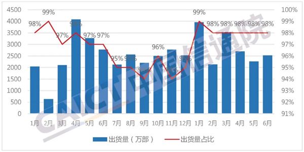2021年1-6月,智能手機(jī)出貨量1.71億部,同比增長(zhǎng)14.8%,占同期手機(jī)出貨量的98.2%。