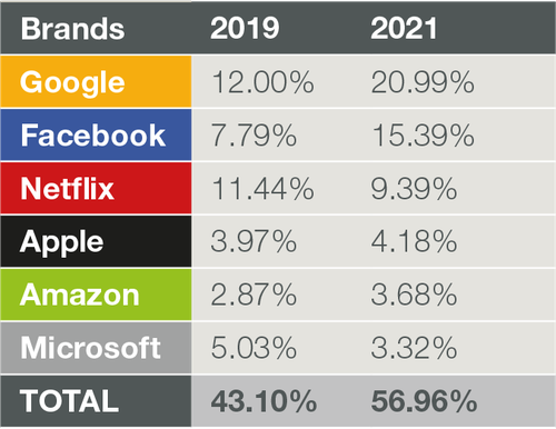 該圖表顯示了六家最大的互聯(lián)網(wǎng)公司在全球網(wǎng)絡(luò)中產(chǎn)生的流量百分比。據(jù)Sandvine稱,在大流行期間,來自最大互聯(lián)網(wǎng)公司的全球網(wǎng)絡(luò)流量已經(jīng)超過一半。