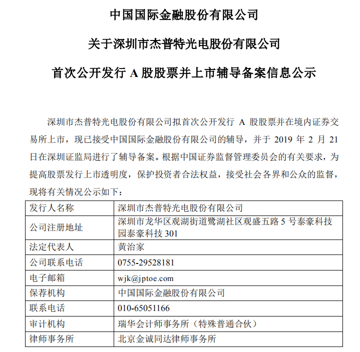 ICCSZ訊 (編輯:Nicole)據(jù)中國國際金融股份有限公司發(fā)布的《關(guān)于深圳市杰普特光電股份有限公司首次公開發(fā)行 A 股股票并上市輔導(dǎo)備案信息公示》文件顯示:深圳市杰普特光電股份有限公司擬首次公開發(fā)行 A 股股票并在境內(nèi)證券交易所上市,現(xiàn)已接受中國國際金融股份有限公司的輔導(dǎo),并于 2019 年 2 月 21日在深圳證監(jiān)局進(jìn)行了輔導(dǎo)備案。