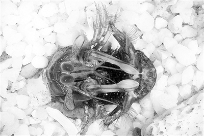 圖為一只螳螂蝦處于防守位置,其腿、頭和尾部區(qū)域反射出圓偏振光,表示隨時(shí)備戰(zhàn)。