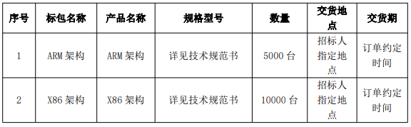 本次招標(biāo)劃分兩個(gè)標(biāo)包,標(biāo)包1為ARM架構(gòu)5000臺(tái),標(biāo)包2為X86架構(gòu)10000臺(tái)。預(yù)計(jì)本次集采金額在2億元左右。