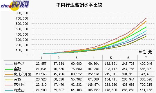 受金融危機(jī)影響,金融行業(yè)排名下滑,高科技行業(yè)重返榜首,排名第一,專業(yè)級(jí)人才年薪已經(jīng)逼近10萬元,戰(zhàn)略規(guī)劃級(jí)的人才能超過70萬元。房地產(chǎn)行業(yè)與高科技行業(yè)