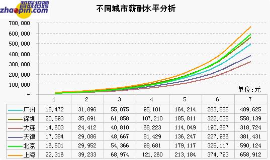 圖表中橫軸的數(shù)字1-7為智聯(lián)招聘職位等級(jí)標(biāo)準(zhǔn)
