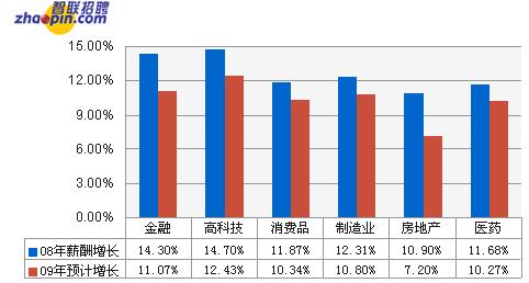 2008年企業(yè)漲薪幅度平均為13.8%,其中高科技行業(yè)漲薪幅度為14.7%,位列第一。金融行業(yè)漲薪幅度略低于高科技行業(yè),為14.3%,位列第二。制造業(yè)漲薪幅度為12.31%,位列第三。受到金融危機(jī)影響,70%企業(yè)對(duì)于此前的2009年度