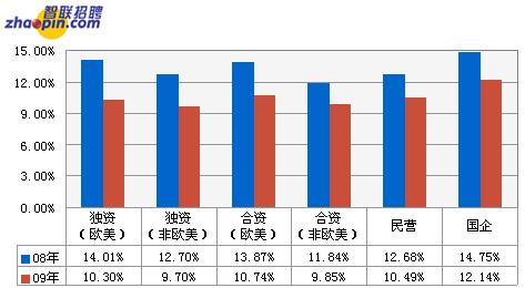 國(guó)有企業(yè)漲薪幅度穩(wěn)居第一。外商獨(dú)資(歐美企業(yè))以及合資(歐美企業(yè))受金融危機(jī)影響最大,09年預(yù)計(jì)漲薪幅度較08年漲薪幅度分別下滑了3.29%及3.13%,為10.3%及10.74%。民營(yíng)企業(yè)的漲薪幅度與合資(歐美企業(yè))差距較小,為10.49%。而外商獨(dú)資(非歐美企業(yè))及合資(非歐美企業(yè))均將到10%以下,分別為9.7%及9.85%