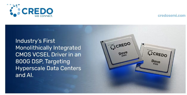Credo Technology近期發(fā)布兩款新品:集成VCSEL驅(qū)動的 Dove 800D及Dove 410D PAM4 光DSP芯片。該兩款芯片可加速客戶產(chǎn)品的上市進(jìn)度,為解決超大數(shù)據(jù)中心、AI后端集群以及通用計算網(wǎng)絡(luò)日益增長的帶寬需求而設(shè)計。