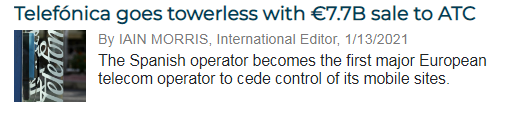 ICC訊(編譯:Nina)周三(2021年1月13日),西班牙電信公司Telefonica SA稱,其子公司Telxius Telecom SA已與American Tower Corp.(AMC)簽署了一項協(xié)議,以77億歐元(約合94億美元)現(xiàn)金將其歐洲和拉丁美洲的通訊塔子公司出售給后者。