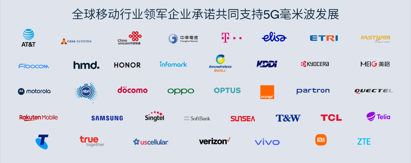 推動當今5G毫米波發(fā)展勢頭的全球移動行業(yè)領軍企業(yè)包括Airtel、AT&T、Casa Systems、中國聯(lián)通、中華電信、德國電信、韓國電子通信研究院(ETRI)、Elisa、愛立信、Fastweb、廣和通、共進電子、HMD Global、榮耀、Infomark、Innowireless、KDDI、京瓷、美格智能、Motorola、澳大利亞國家寬帶網(wǎng)絡、諾基亞、NTT DOCOMO、OPPO、Optus、Orange、Partron、移遠通信、樂天移動、三星電子、新加坡電信、軟銀、日海智能、TCL通訊、Telia Finland、Telstra、TIM、True Corporation、UScellular、vivo、沃達豐、小米和中興通訊。上述企業(yè)與高通技術(shù)公司合作,共同推動5G毫米波網(wǎng)絡和終端的普及。