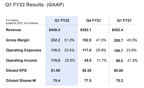 銷售收入4.48億美元,上個財季銷售收入3.92億美元,去年同期銷售收入4.52億美元,即環(huán)比增長14.4%,同比微幅下滑0.9%。