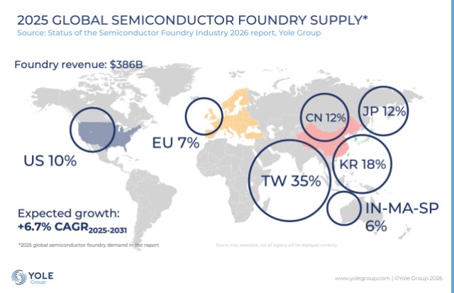 圖1:2025年全球半導(dǎo)體代工供應(yīng)情況:臺灣繼續(xù)以占3860億美元代工總收入35%的份額引領(lǐng)全球格局,其次是韓國(18%)和中國(12%)。預(yù)計到2031年,該行業(yè)將以6.7%的年復(fù)合增長率增長。(來源:Yole Group)