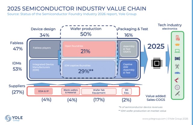 圖2:2025年半導(dǎo)體行業(yè)價值鏈:晶圓生產(chǎn)占行業(yè)增加值的50%,分為開放代工(21%)和IDM自有代工(29%)。該圖突顯了供應(yīng)商——以晶圓廠設(shè)備為首(占17%)——在支持從器件設(shè)計到最終科技行業(yè)電子產(chǎn)品轉(zhuǎn)型中的關(guān)鍵作用。(來源:Yole Group)