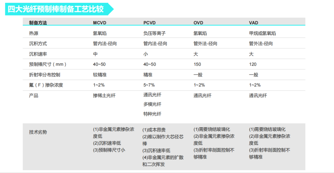 “縱向來看,國產(chǎn)的特種光纖預(yù)制棒制備工藝,主要是由以前通訊光纖預(yù)制棒制備的四種工藝改造而來,這也就意味著它們在針對非金屬元素摻雜存在一定的技術(shù)瓶頸。”童維軍介紹道。