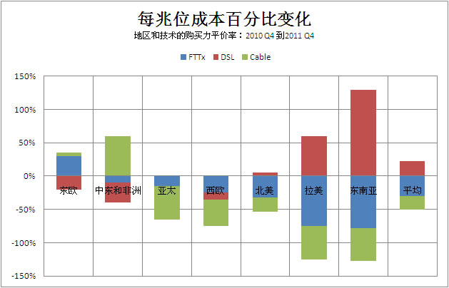 在寬帶接入技術(shù)上,F(xiàn)iber市場份額增長最快。消費者想要,運營商想售導(dǎo)致了其每兆位成本較低。如圖所示,亞太地區(qū)僅僅0.41美元,而北美地區(qū)則貴過這個價格的五倍,這種差異看上去是很有意思。