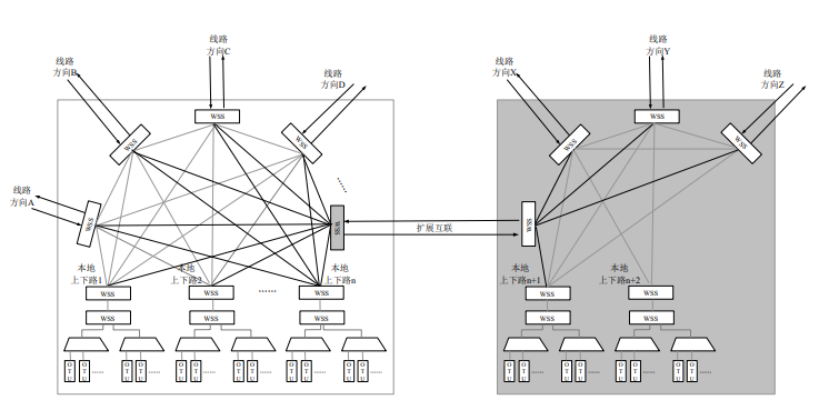 WSS作為ROADM技術(shù)的核心器件,其端口數(shù)就成為ROADM網(wǎng)絡(luò)的擴容瓶頸。目前,成熟商用的WSS器件達到了20維。那么一旦某個城市節(jié)點的WSS端口用完了,這張網(wǎng)是不是就必須要新建了呢?其實,WSS端口的瓶頸可以通過在這個城市機樓再增加一端平行節(jié)點設(shè)備來突破,兩端節(jié)點設(shè)備通過WSS器件互聯(lián)實現(xiàn)互通,如圖4所示。圖4中灰色色塊代表新增設(shè)備和板卡。通過一對WSS板卡完成的互通,并不是全交叉連接的,平行節(jié)點之間連接帶寬只有80個波長,互通受限。因此,并不推薦無限制地去擴展WSS維度。