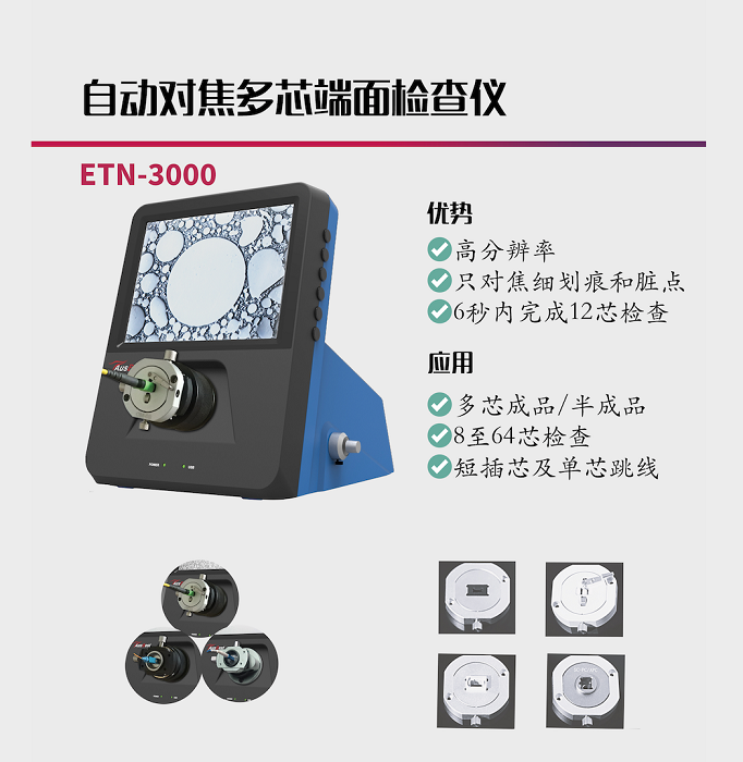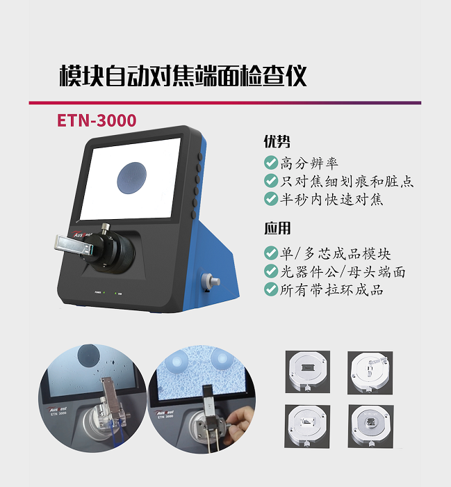 本屆武漢光博會(huì)億天龍主要展示臺(tái)式自動(dòng)對(duì)焦和自動(dòng)測(cè)試判斷一體化端檢儀,主要包含:單芯,多芯模塊,結(jié)構(gòu)組件,及MTP/MPO,單芯跳線端面檢測(cè)儀,同時(shí)也將展出光纖端面新材料電動(dòng)清潔器,以及各型號(hào)手持式端檢儀,wifi自動(dòng)判斷端檢儀。
