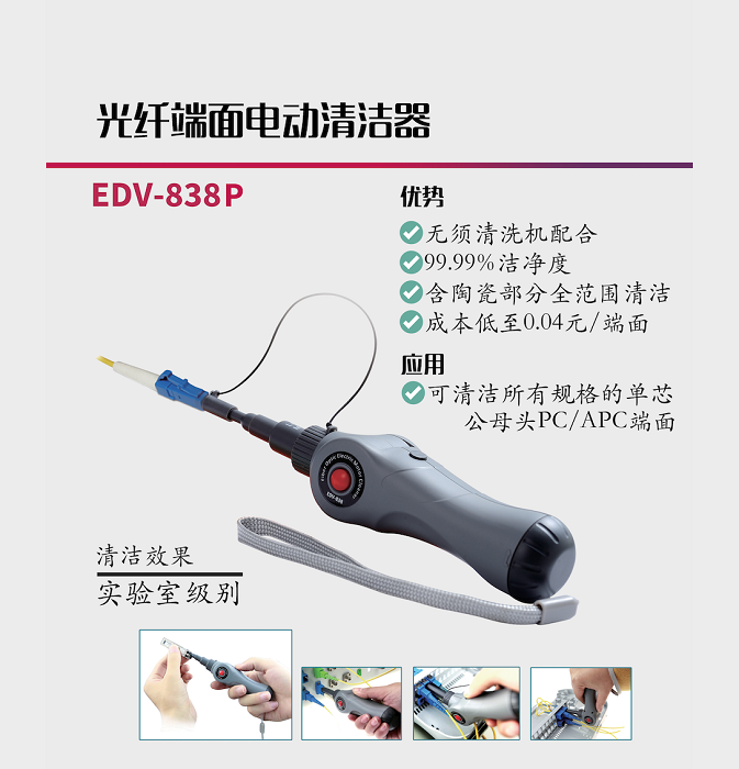 電動(dòng)清潔器是億天龍十余年暢銷不衰的產(chǎn)品之一。本次將展示全新材料的清潔效果。清潔安全可靠,標(biāo)配的清潔耗材可以清潔4000個(gè)端面。