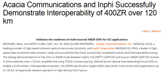 ICC訊(編譯:Nina)日前,高速相干光互連產(chǎn)品的領(lǐng)先提供商Acacia Communications公司(納斯達(dá)克:ACIA)和高速數(shù)據(jù)移動(dòng)互連的領(lǐng)導(dǎo)者Inphi公司(納斯達(dá)克GS:IPHI)宣布他們已經(jīng)成功完成模塊級(jí)互操作性測(cè)試。測(cè)試證明,在使用75GHz信道間隔的120公里放大鏈路上,Inphi的COLORZ®II QSFP-DD和Arista交換機(jī)中的Acacia 400ZR QSFP-DD模塊之間在400ZR模式下能實(shí)現(xiàn)無錯(cuò)誤鏈接。400ZR標(biāo)準(zhǔn)是由OIF定義,旨在實(shí)現(xiàn)多廠商、可互操作的生態(tài)系統(tǒng),以高密度封裝形式針對(duì)Hyperscale網(wǎng)絡(luò)運(yùn)營商的上達(dá)120公里的400G數(shù)據(jù)中心互連(DCI)應(yīng)用。
