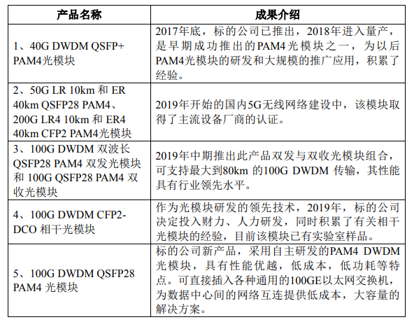標(biāo)的公司光模塊產(chǎn)品的研發(fā)著眼于將新型的光調(diào)制技術(shù),如 PAM4,相干光等,以及應(yīng)用于小型化的高速光模塊等。標(biāo)的公司已實(shí)現(xiàn)產(chǎn)品化的研究成果如下: