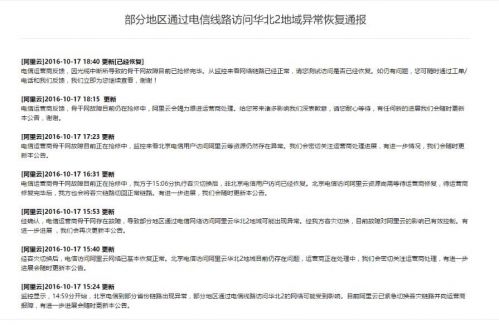 阿里云在15:24分發(fā)出官網(wǎng)公告,并跟蹤故障進(jìn)展,期間阿里云做了鏈路容災(zāi)切換,通過(guò)繞行杭州解決了外地用戶(hù)無(wú)法訪問(wèn)北京節(jié)點(diǎn)問(wèn)題。最后在18:40公告表示故障已經(jīng)由北京電信完全修復(fù)。