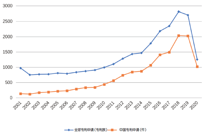 圖1 6G在全球、中國(guó)專利申請(qǐng)數(shù)量的年度趨勢(shì)