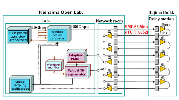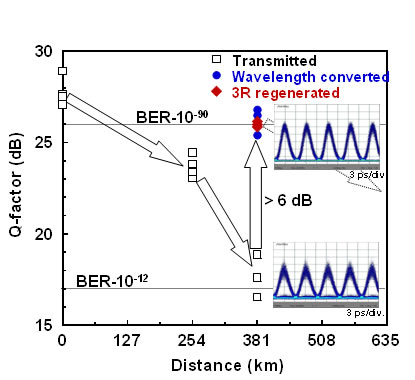 導入了上述裝置的光信號再生中繼實驗驗證了原理上傳輸距離幾乎不受限制的理論。迄今為止的研究成果表明,只有在每秒40千兆位、每秒80千兆位的傳輸速度下實現(xiàn)了光3R中繼傳輸。在現(xiàn)場以每秒160千兆位的傳輸速度,實現(xiàn)光信號品質(zhì)再生在世界上還是首創(chuàng)。而且,此次在光實驗網(wǎng)上,通過不斷改變線路折回次數(shù),對中繼距離進行評估和測定,傳輸距離最長達到了380km。這樣一來,東京―─大阪間相當于只需一次光3R再生中繼,就能高品質(zhì)傳輸每秒160千兆位數(shù)據(jù)的中繼距離。