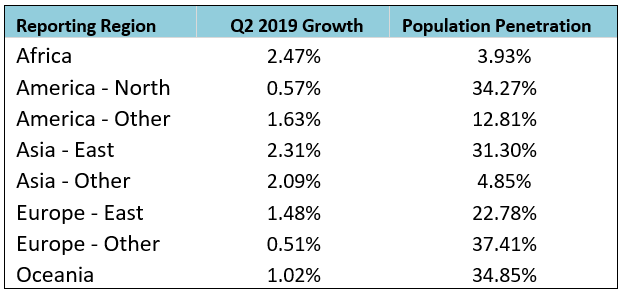 與2019年第一季度相比,世界其他地區(qū)的季度增速有所下降,非洲的最大差異為-1.93%。 大洋洲緊隨其后,為-1.02%。 盡管如此,非洲仍然是增長最快的地區(qū)(環(huán)比增長2.47%)。 這是因為其市場飽和率較低導(dǎo)致的,該地區(qū)在所有固定寬帶用戶中的市場占有率第二低,為1.84%,其固定寬帶普及率也最低,為3.93%(圖6)。