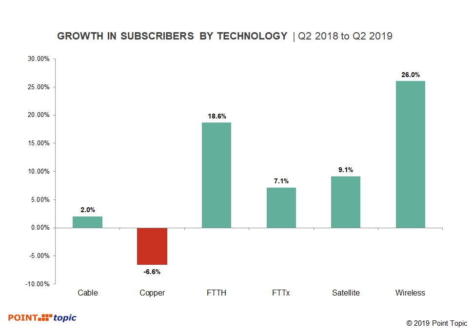 在2018年第二季度至2019年第二季度期間,copper數(shù)量下降了6.6%,而FTTH連接數(shù)量增長了18.6%,F(xiàn)TTx / VDSL增長了7.1%。