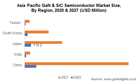 2020年,亞太GaN和SiC功率半導(dǎo)體市場占總收入的65%以上,由于日本政府支持該國半導(dǎo)體制造的積極舉措,預(yù)計2021年至2027年的復(fù)合年增長率將達到34%。例如,2020年4月,日本政府宣布提供22億美元的資金,以幫助其國內(nèi)制造商將其生產(chǎn)轉(zhuǎn)移到中國,以克服供應(yīng)鏈障礙。