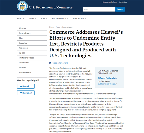 美國商務(wù)部部長威爾伯·羅斯稱:“盡管美國去年采取了(將華為列入)‘實(shí)體清單’的措施,但是華為及其海外關(guān)聯(lián)機(jī)構(gòu)通過一系列本土化舉措,削弱了這些涉及國家安全的限制。這不是一家負(fù)責(zé)任的企業(yè)的所作所為。我們必須修訂被華為和海思利用的規(guī)則漏洞,保護(hù)美國技術(shù)免受惡意利用,威脅美國國家安全和海外利益?!?
