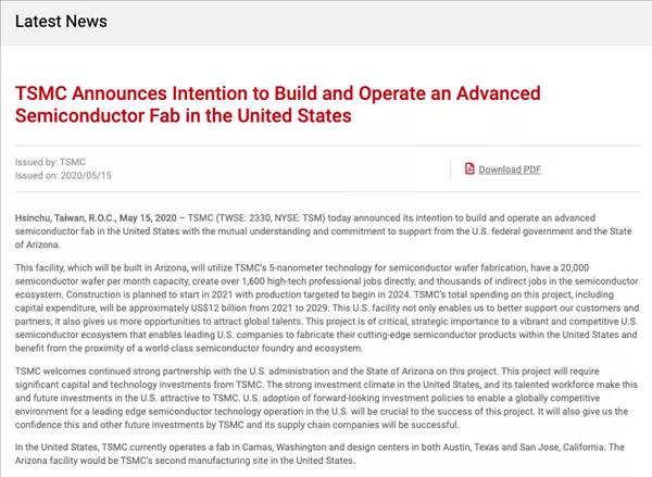 就在此次美國推出限制升級之前,5月15日,臺積電在官網(wǎng)正式宣布,在美國聯(lián)邦政府及美國亞利桑那州的共同理解和其承諾支持下,計(jì)劃在美國興建并運(yùn)營一個先進(jìn)的晶圓廠。