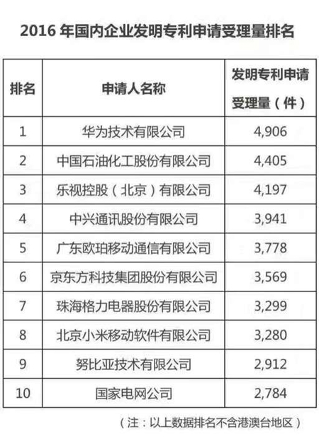 中國(guó)2016專(zhuān)利申請(qǐng)受理量排名:華為高居榜首 中興小米成績(jī)斐然