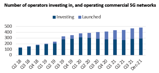 - 到2021年12月,GSA確定全球有144個國家/地區(qū)的481家運營商在投資5G,而2020年底則為412家運營商。