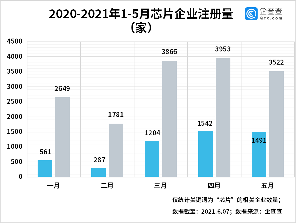 芯片價(jià)格飆漲 5 倍,2021 年 1-5 月我國新增芯片企業(yè) 1.57 萬家,同比增長 230%