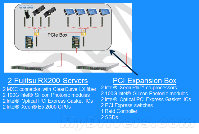 富士通使用了兩臺標準的Primergy RX200服務器,各自增加一個Intel硅光子模塊,以及一顆Intel專門設計的FPGA芯片。后者負責必要的信號調(diào)制工作,通過MXC連接器將PCI-E協(xié)議以光信號的形式傳輸?shù)綌U展盒中。