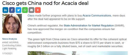 ICC訊(編譯:Nina)據(jù)外媒Light Reading消息,周二,思科收購(gòu)Acacia取得了進(jìn)一步進(jìn)展。中國(guó)的反壟斷監(jiān)管機(jī)構(gòu)--國(guó)家市場(chǎng)監(jiān)督管理總局(SAMR)現(xiàn)已批準(zhǔn)了這宗并購(gòu),條件是兩家公司必須確保公平競(jìng)爭(zhēng)。