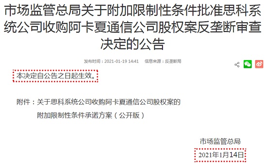 附鏈接:市場(chǎng)監(jiān)管總局關(guān)于附加限制性條件批準(zhǔn)思科系統(tǒng)公司收購(gòu)阿卡夏通信公司股權(quán)案反壟斷審查決定的公告