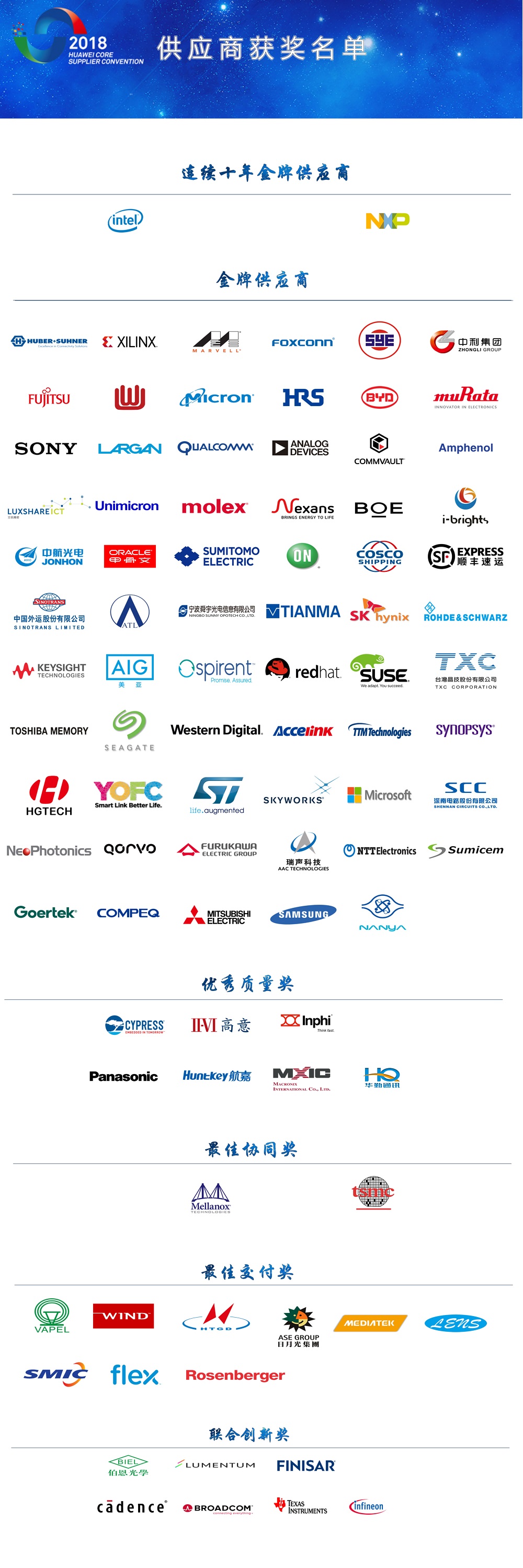 2018年華為全球核心供應(yīng)商大會獲獎名單(中文對應(yīng))