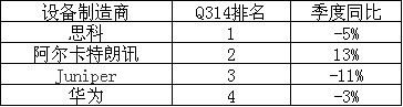 思科、阿爾卡特朗訊、Juniper和華為是服務供應商路由器市場的主要領導者,2014年三季度它們占據(jù)該市場收入超過94%。三季度,思科仍然占有領先地位,阿爾卡特朗訊排名第二位,Juniper和華為分別為第三和第四大供應商。