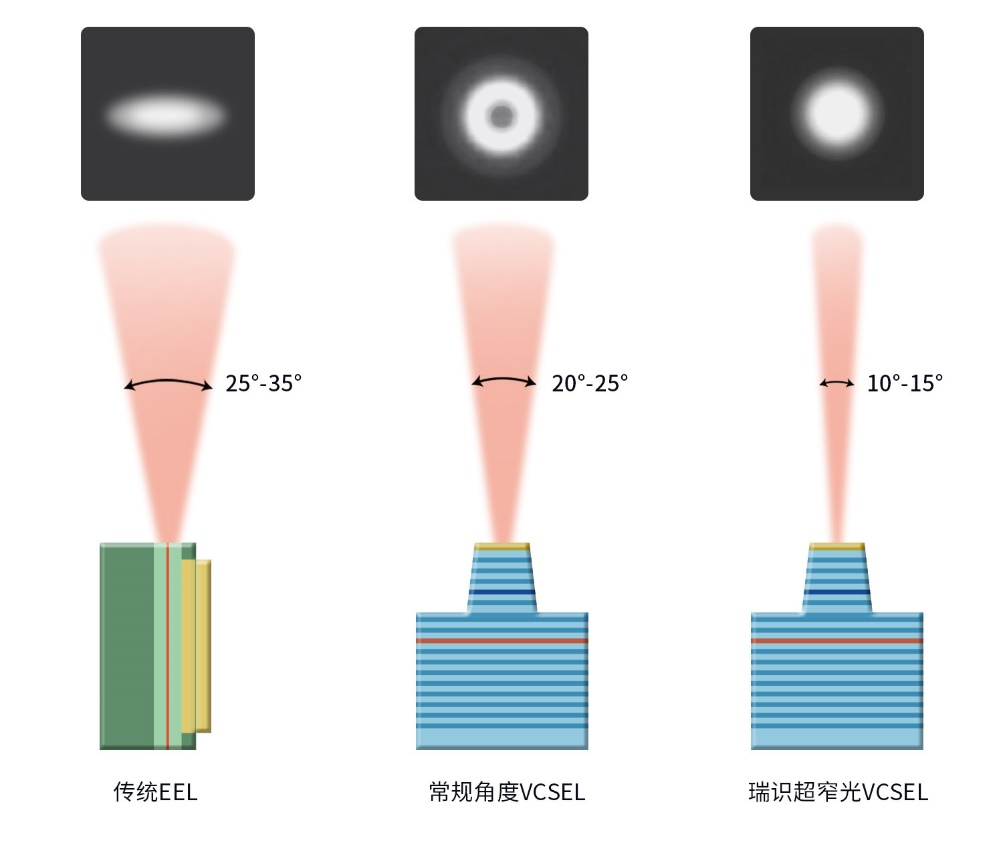 瑞識超窄光VCSEL技術為LDS激光雷達提供光斑尺寸更小光型更加均勻的圓形光斑(右),克服了傳統(tǒng)EEL激光的橢圓形光斑(左)和常規(guī)角度VCSEL光斑中間暗四周亮的不足(中)。