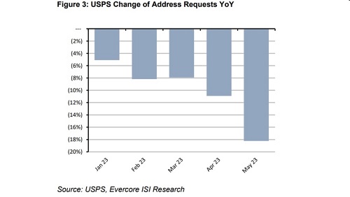 Evercore ISI表示,5月份的遷移活動(dòng)同比下降了18%,低于4月份的-11%、3月份的-8%和2023年第一季度的-7%的平均水平。進(jìn)一步分析,與2022年5月相比,2023年5月永久更改地址請(qǐng)求總數(shù)下降了41.6萬,低于2023年4月的-23.4萬。
