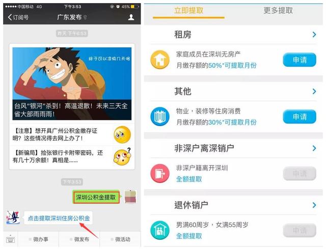 1、關(guān)注 “廣東發(fā)布”(微信號(hào):gdfabu0710) ,回復(fù)“深圳公積金提取”,可直接辦理以下4類提取業(yè)務(wù):租房提取、非深戶離深銷戶提取、其他住房消費(fèi)提取、退休銷戶提取。
