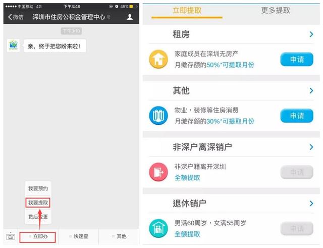 2、關(guān)注“深圳市住房公積金管理中心”官方微信,點(diǎn)擊功能菜單“立即辦——我要提取”。