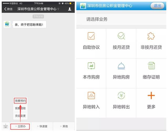 2、關(guān)注“深圳市住房公積金管理中心”官方微信,點(diǎn)擊功能菜單“立即辦——我要預(yù)約”。