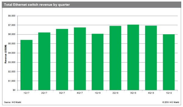 IHS分析表示,由于季節(jié)性需求放緩,2018年第一季度以太網(wǎng)交換機(jī)收入環(huán)比下滑10%;但從同比12%的增幅(高于上季度的7%)來(lái)看,該市場(chǎng)前景樂(lè)觀并且在本季度得到進(jìn)一步增強(qiáng)。