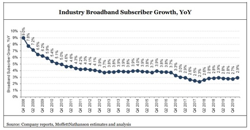 據(jù)Light Reading報道,MoffettNathanson的新數(shù)據(jù)顯示,部分由于流行病的影響,美國寬帶用戶數(shù)量在2020年第一季度再次加速增長,同比增長2.9%。