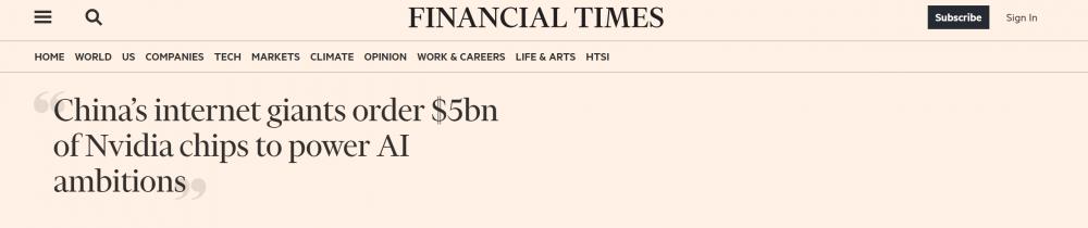 ICC訊 財聯(lián)社消息,據(jù)英國《金融時報》周三報道,中國的互聯(lián)網(wǎng)巨頭正爭相收購英偉達的高性能芯片,這些芯片對構(gòu)建生成式人工智能系統(tǒng)至關(guān)重要,據(jù)悉這些訂單價值50億美元。
